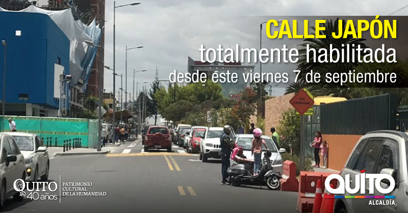 La Empresa Pública Metropolitana Metro de Quito (EPMMQ) comunica a la ciudadanía que a partir del viernes 7 de septiembre, desde las 12h00, se ha habilitado la circulación en la calle Japón en el tramo comprendido entre Vicente Cárdenas y Agustín Guerrero, en el norte de la ciudad. Esto, toda vez que se ha finalizado las tareas de mejoramiento de… Leer más »Se habilita totalmente la calle Japón