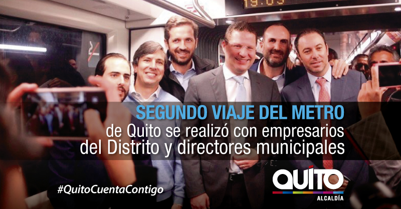 A las 11:30 de este martes 19 de marzo, el Metro de Quito realizó su segundo viaje que es parte de las pruebas dinámicas sobre rieles, desde la estación de Iñaquito hasta la de Jipijapa y tuvo como invitados a empresarios del Distrito, directores y gerentes de empresas municipales. El alcalde Mauricio Rodas indicó que este segundo viaje del tren… Leer más »Empresarios de la ciudad y directores municipales viajaron en el Metro de Quito