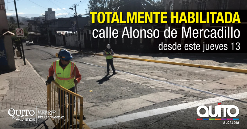 La Empresa Pública Metropolitana Metro de Quito (EPMMQ) comunica a la ciudadanía que a partir de este jueves 13 de septiembre, se habilitó por completo la circulación vehicular en la calle Alfonso de Mercadillo. Recordamos que el paso vehicular por dicha calle se mantuvo suspendido desde el inicio de la intervención en la Av. América, debido a la construcción de… Leer más »Se habilita totalmente la calle Alfonso de Mercadillo