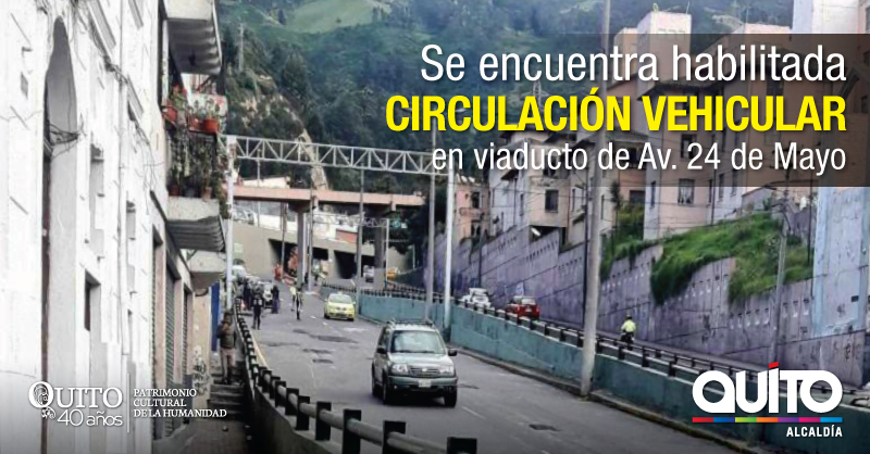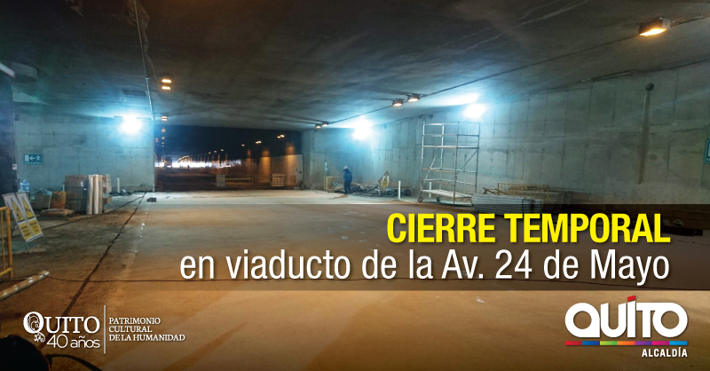 La Empresa Pública Metropolitana Metro de Quito (EPMMQ) comunica a la ciudadanía que a partir del día miércoles 27 de junio, a las 22h00, hasta el viernes 29 a las 6h00, se suspenderá la circulación vehicular por el Viaducto 24 de Mayo. Esta suspensión temporal se debe a la realización de trabajos complementarios necesarios en el pozo de bombeo ubicado… Leer más »Suspensión temporal de circulación por Viaducto 24 de Mayo
