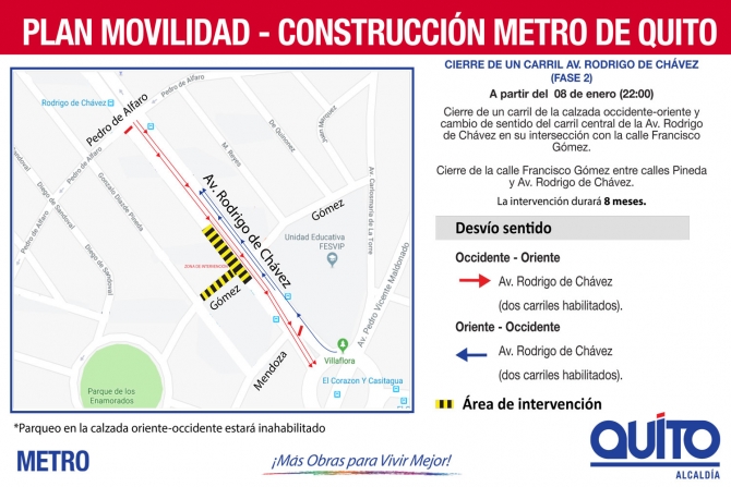 La Empresa Pública Metropolitana Metro de Quito (EPMMQ) comunica a la ciudadanía que a partir del lunes 08 de enero a las 22h00, se cerrarán tres carriles en la Av. Rodrigo de Chávez, al sur de la ciudad.